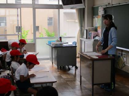 2年生の体育の「とびばこ」の学習が始まります。いまから体育館へ移動するのですが、学習のめあてや安全に活動するためのルールを確認していました。こういうことも体育の大事な勉強です。