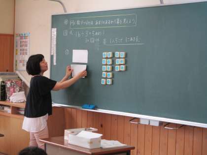 3年生の算数「あまりのあるわり算」です。かけ算の考え方を使いながら、数図ブロックであまりの数を考えていました。こうやって数図ブロックでイメージをしておくことで、今後の学習の理解がしやすくなります。