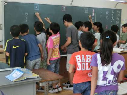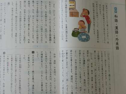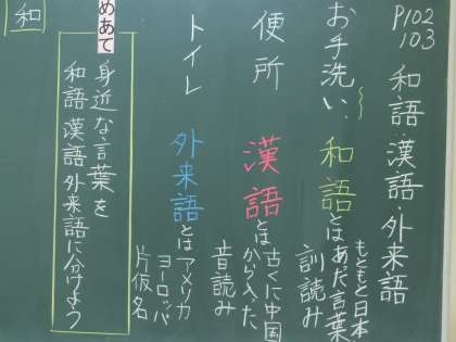 国語の時間に、「和語・漢語・外来語」の分類に挑戦していました。身近な生活の中で、言葉を見つけて黒板に書いていきます。児童の様子を見ていると、真っ先に外来語を書いていました。言葉から受ける感じ(語感)の違いを肌で感じられるといいですね。