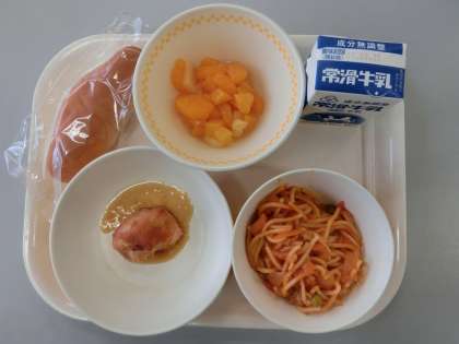 小型ロール スパゲティイタリアン 鶏肉のバーベキューソースかけ フルーツポンチ 牛乳