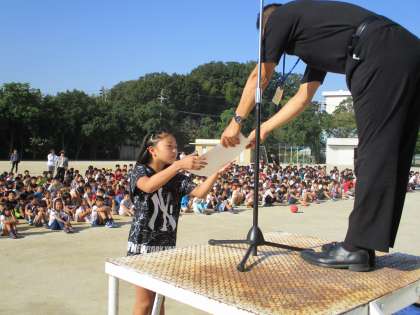 月曜ですので朝会がありました。いつものように表彰をしたあと、校長先生からお話がありました。今日のお話は国民の祝日が年に16日あるというお話でした。先日の23日は「秋分の日」で、昼と夜の長さが等しくなる日ですが、ご先祖様を敬いしのぶ日でもあるということを教えていただきました。1年の祝日を全部覚えた子は、ぜひ校長室に来て下さいということです。チャレンジしてみてください。