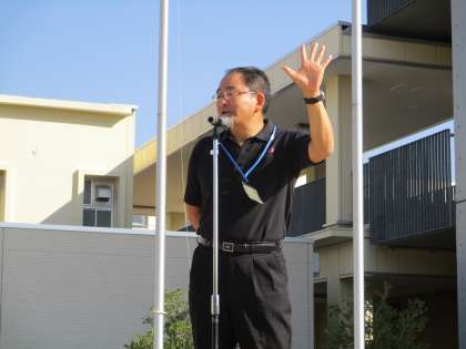 ところで、本校では運動場で朝会を行う時は、毎回、金管部の生演奏で校歌を歌っています。当たり前のように毎週やっているのですが、なかなかすごいことだと思いますので写真で紹介します。