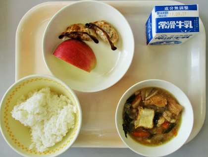 生揚げの中華煮 ごはん ぎょうざ2個 りんご 牛乳