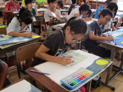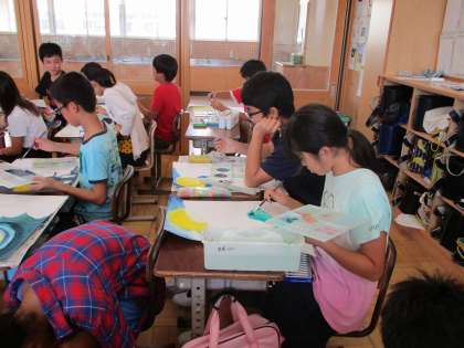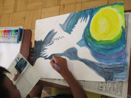 6年生の図工です。「百羽のツル」のお話を題材にして、読書感想画を描いていました。題材とする話は学級によって違うそうです。この学級では、背景の夜空をグラデーションの技法を意識して表現していました。