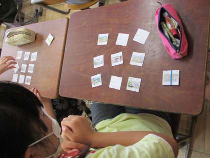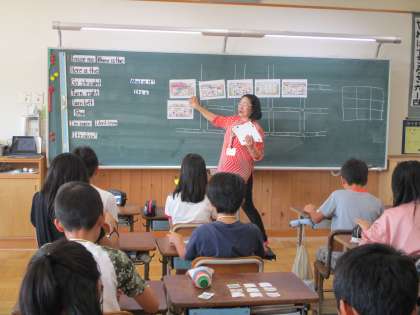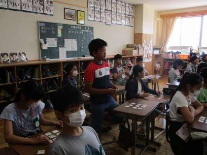 6年生の外国語活動です。一人一人に絵カードが配られ、ビンゴゲーム形式で楽しく英語を学んでいました。楽しみながら、疑問文の応答や、消防署、警察署などの単語に親しんでいきます。