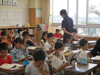 4年生の国語で、今後の学習についてのオリエンテーションが行われていました。総合的な学習と関連づけて「リーフレットを作ろう」を扱うこと、説明文「アップとルーズで伝える」で文章について学ぶことなどを確認していました。