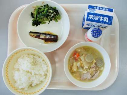 ごはん 呉汁 イワシの梅しょうゆ煮 小松菜の和え物 発酵乳 牛乳