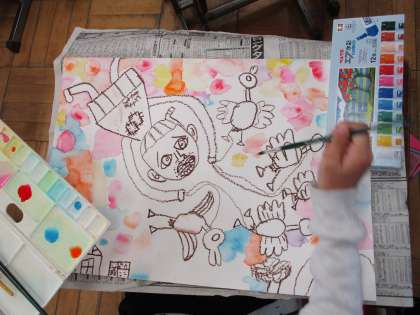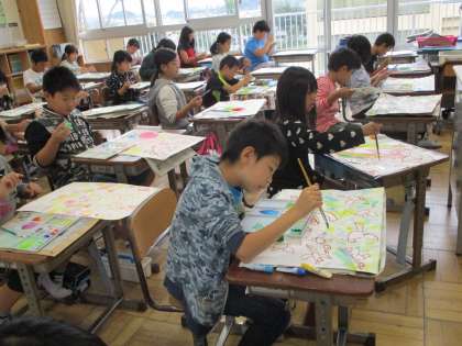 4年生の図工です。読書感想画をクレパスと水彩絵の具を使って描いています。クラスごとに物語が違います。この学級は「かもとりごんべえ」。鮮やかな色、ダイナミックな構図・・・一人一人が物語の豊かな世界を画用紙に繰り広げています。