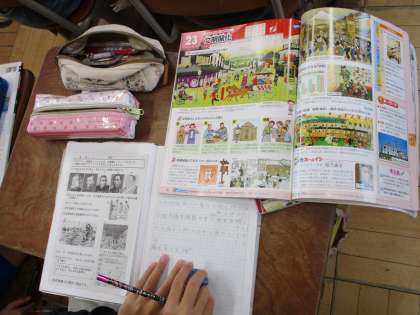 6年生の社会科です。今日まで学んできた明治維新の内容について、先生にアドバイスをしてもらいながら各自でまとめをしていました。6年生にもなると、自力でこういう学習のまとめもできますね。