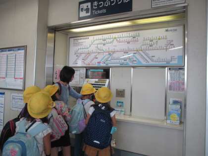 2年生の校外学習の様子を写真でお伝えします。みんな元気に出発し、寺本駅で一人一人がキップを買いました。各学級で事前に練習したとおり、みんなスムーズに買うことができました。聚楽園駅で下車し、しあわせ村に向かいました。