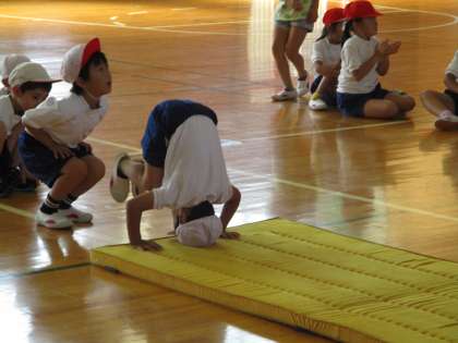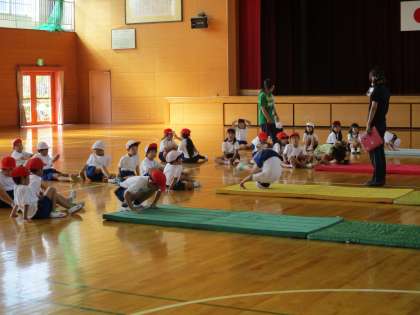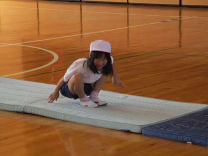 1年生の体育でマット運動をしていました。先生の号令に合わせて前回りをしています。手の構え方、頭のつけ方など一つずつアドバイスをもらいながら、何度も実際に回ってみて、体で動きを覚えていっています。