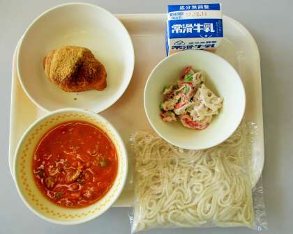 今日はソフトめんです。しかも昔から定番のミートソースです。いわゆる「きなこ揚げパン」も昔からある給食の定番ですね。教師からすると、なつかしさを感じる献立でした。