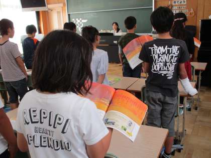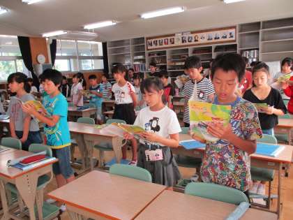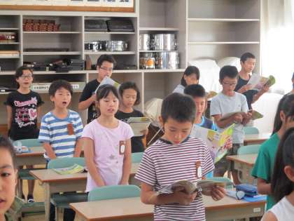 4年生の音楽です。「大切なもの」「赤とんぼ」といった歌を、たいへん美しい声で歌っていました。美しい歌声になるのは、一人一人が歌の世界にひたって心を込めて歌っているからでしょうね。