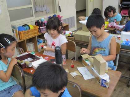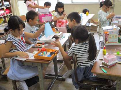 2年生の図工です。今まで作ってきた「ともだちハウス」が完成しました。今日は,最後の仕上げをし、自分の作品の工夫したところを先生や友達に伝えていました。一人一人の作り上げた箱の中の世界、すばらしいですね。