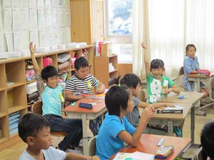 3年生の算数で、円の中にできている三角形について、どんな三角形か考えたり、特徴を考えたりしていました。先生がモニターにうつした図形をみて、クラス全員で真剣に考えて意見を出し合っていました。