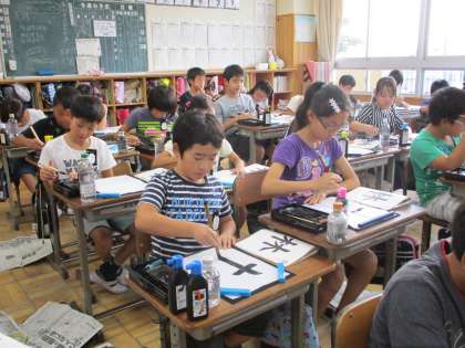 4年生の書写です。「林」という字を書いています。たった一文字で、しかも「木」を二つ並べるだけのように見えますが、書写として半紙に書こうとすると、バランスをとるのが大変難しく、へんとつくりで点画も違っており、子どもたちも苦戦しています。一枚描くたびに、お手本と見比べ、改善点を考えていました。