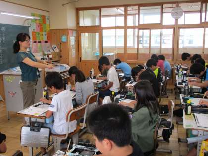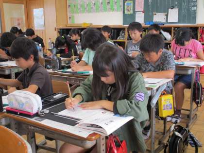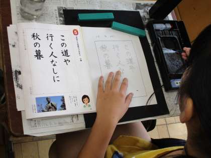 6年生の書写です。小筆を使って松尾芭蕉の句を書いています。「この道や 行く人なしに 秋の暮」。さすが6年生の教科書。深いですね。小筆の扱いが上達してきています。