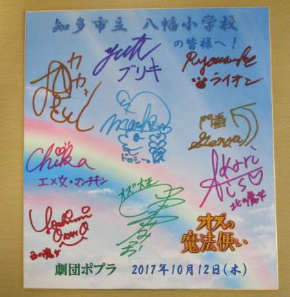 今年は劇団ポプラさんに来ていただきましたが、舞台セット等の片付けがすべて終わって職員室にあいさつに来て下さったのが17:30過ぎ。朝も早かったのですが、ミュージカルの90分を成立させるためには、とてもたくさんの時間が必要なんですね。八幡小のみんなに、今日の出演者の俳優さんたちから色紙をいただきましたので、このHPで紹介します。
