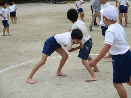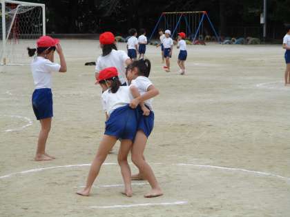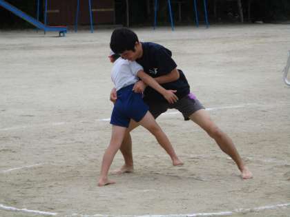 3年生の体育で、すもうの練習をしていました。3年生にもなると、腰が入ったずいぶん本格的な取組になっています。教育実習の先生も、子どもたちの練習の相手となってくださっています。