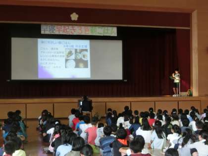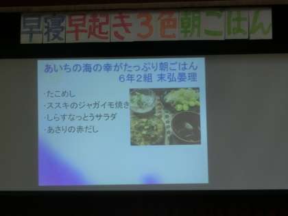 本年度第2回目となる学校保健委員会を開催しました。「早寝・早起き・3色朝ごはんで元気なやわたっ子 −愛であ朝ごはんをつくろう−」というテーマで、5、6年生を対象にし、PTA保体部のみなさまのご協力のもと実施しました。夏休みの「わが家の愛であ朝ごはんづくり」の優秀作品の紹介をとおして、本校のテーマである。「早寝・早起き・3色朝ごはん」の大切さを考えました。栄養教諭の先生に講評をいただき、より理解を深めることができました。