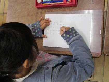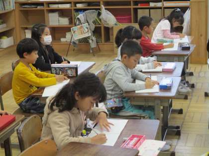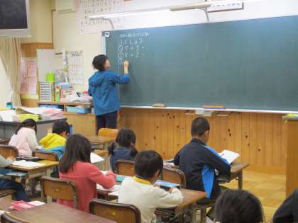 1年生の算数です。今までていねいに学んできたたし算の復習をしていました。もう、数図ブロックを使わなくても計算できていますね。