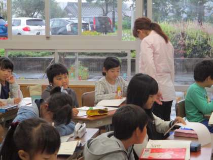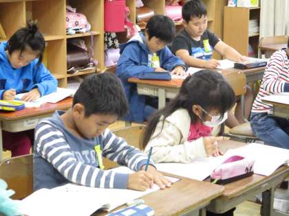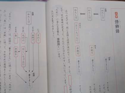 3年生の国語です。主語、述語についてすでに学んでいますが、今日は修飾語について学んでいました。たとえば、「わたしは書きました」というそっけない文も、修飾語を加えることで具体的になり、相手によく伝わる文になっていきますね。