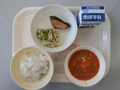 今日はハヤシライス。デミグラスソースのいい香りが漂っています。サケは、ただの塩焼きではなく「ハーブ焼き」とのことでおしゃれですね。まめまめサラダは大豆、枝豆の組み合わせで栄養価の高そうなサラダです。今日もおいしそうです。