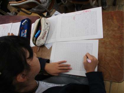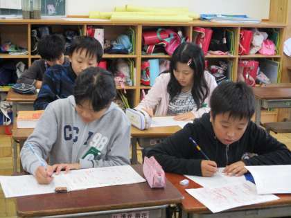 6年生の国語で意見文を書いています。「未来がよりよくあるために」というテーマで、差別や犯罪、環境問題など各自が課題を設定し、調べて意見文を書いています。6年生の意見文は、6年間の学習の総まとめ。文章の組み立てをしっかりと意識し、自分の主張が読み手に伝わるような文章を書いています。