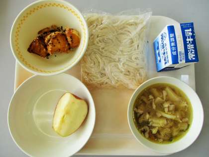 今日は先週にひき続き、ソフトめんです。先週はミートソースでしたが、今日は和風かけ汁。大人にとっては、和風かけ汁のほうが落ち着く味のように思いますが、子どもたちはどうなんでしょうね。