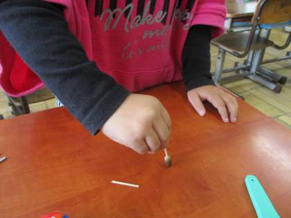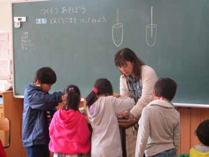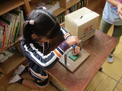 1年生の生活科で「どんぐりごま」を作っていました。ドリルで穴をあけて、つまようじをさして完成します。中心に穴をあけるのに苦労していましたが、先生の助けも借りて完成させていました。コマのまわり方はいろいろですが、たのしくまわしていました。
