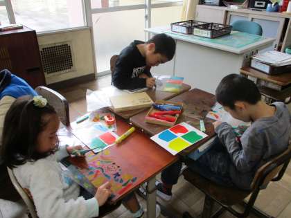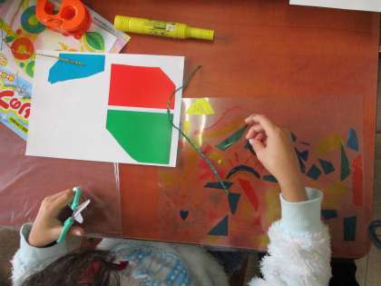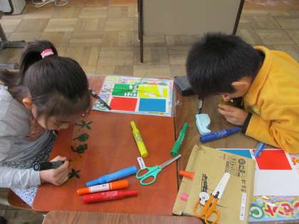 2年生の図工で「ひかりのプレゼント」という作品作りをしていました。色セロファンを組み合わせて、ステンドグラスのイメージでの作品ですね。自分の好きな動物や花など、いろいろなものをイメージして作っています。