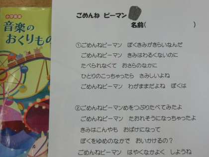 音楽の時間に、「ごめんね、ピーマン」という楽しい曲をみんなで歌っていました。