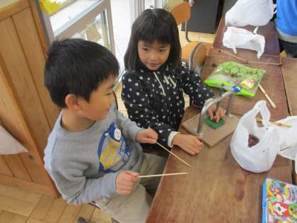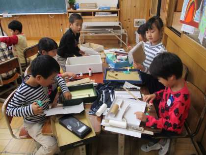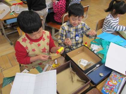 すもう大会が終わり、次の目標は土曜公開日です。1年生は、どんぐりなどを使って遊ぶおもちゃを作り、お客さんをおもてなしをします。その準備をしていました。