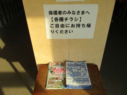 なお、本日、各昇降口に写真のようにチラシを置かせていただきます。必要な方はご自由にお取り下さい。