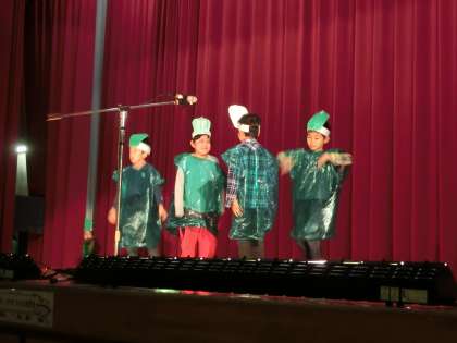 2年生は体育館で発表でした。1組は「とうもろこしとオクラのひみつ」、2組は「みんなピーマン大すき2年2くみ」、3組は「カッパくんと子どもたちの友じょう」、4組は「トマトはかせがまっている トモちゃんたちの大ぼうけん」。