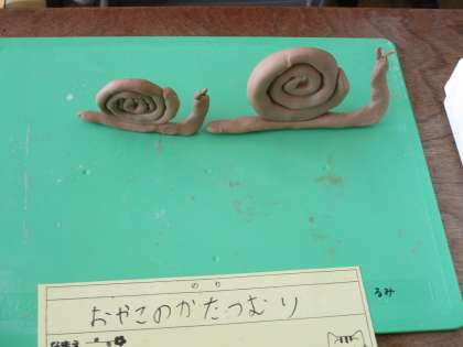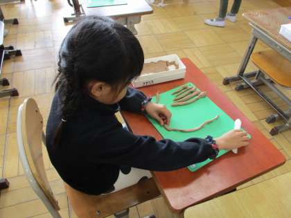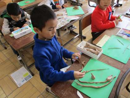 1年生の図工で「ひもひもねんどであそぼう」という活動をしていました。粘土をひも状にし、そこから作りたいものの形を仕上げていきます。かたつむり、へびのような生きものからイスや橋などまで、さまざまな作品ができていました。