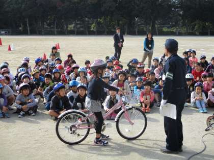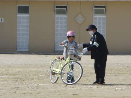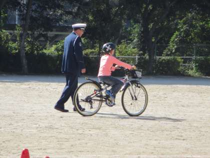 3年生は、午前中に交通安全教室を実施しました。知多警察署のおまわりさん、交通指導員のみなさんに来ていただき、自転車の乗り方についてていねいに指導していただきました。