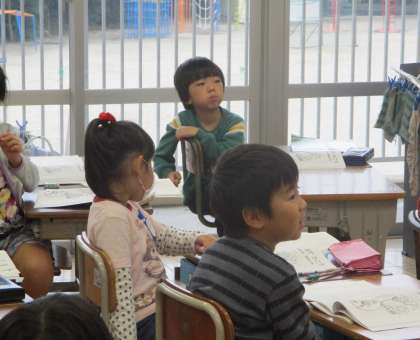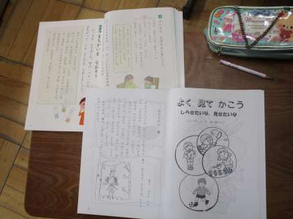 1年生の国語で、「知らせたいな見せたいな」という単元に入りました。作文の単元で、「知多の友」という作文ワークを使って授業が進んでいきます。今日は、八幡小学校の中にあるもので、家の人に紹介したいものを考えていました。こうやって、「文章に書きたい」という思いを大切にして、作文の指導をしていきます。