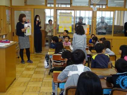 授業は生活科「つくろう あそぼう」で、秋のお店屋さんに保育園児を招いて楽しく遊んでもらうために、どんな工夫をしたらよいか話し合う授業でした。たくさんのお客さんが見ている中でしたが、子どもたちは集中し活発に話し合うことができました。