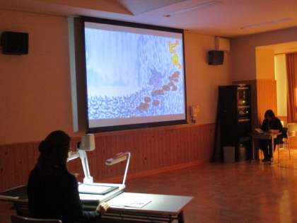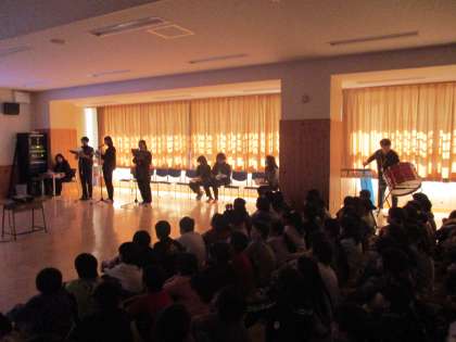 「あらしのよるに」は子どもたちに人気の高い絵本で、たくさんのシリーズがありますが、それらをメンバーの方々が役割分担して、音響効果も入れながら本格的に聞かせていただきました。毎月、朝の会の前にしていだたいている短い時間での絵本の読みきかせとはまったくスケールが違う読みきかせで、4年生の子どもたちは物語の世界に引き込まれていました。