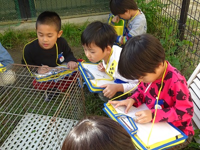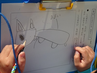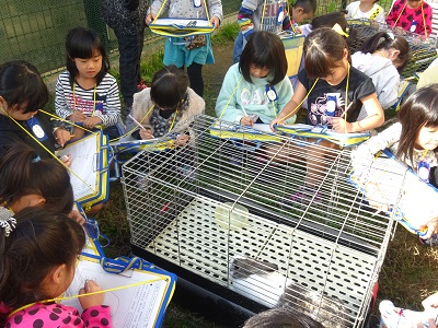 「しらせたいな 見せたいな」という単元で,人に身のまわりの物の様子を伝えます。本時はみんなでウサギを観察していました。伝えたいこともきちんとメモできていますね。