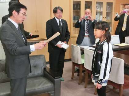 総務省 中部管区行政評価局 総務行政相談部長の加藤寿之様をはじめ、たくさんの方においでいただき、行政相談週間書写コンクールの表彰が校長室で行われました。