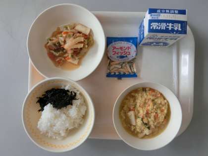 ごはん 親子煮 白菜の土佐和え しそひじきの佃煮 アーモンド入り乾燥小魚 牛乳