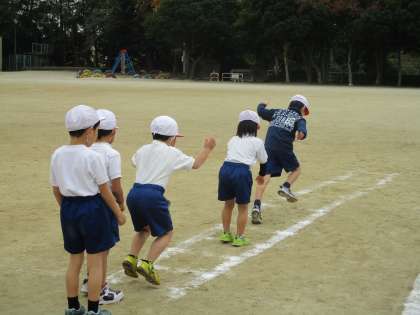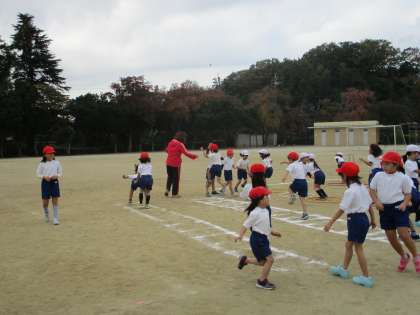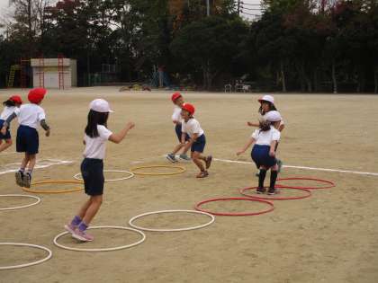 1年生の体育です。輪やはしごが用意されて、そこを跳んでいきます。一個一個跳んでいくだけでなく、一マスとばして跳んだり、ケンパーをしたりしながら、さまざまな跳び方をします。楽しみながら、跳ぶ動きを高めています。