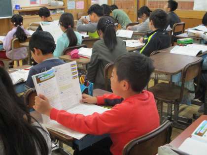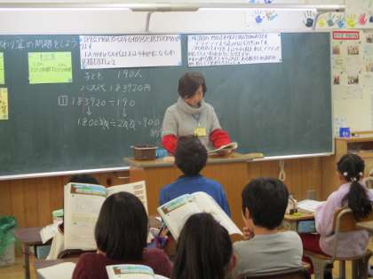 4年生の算数です。「子ども会190人でバス4台を借りると183,920円でした。1台分のバス代はおよそ何円になるでしょうか。」。この問題のポイントは、「およそ何円」というところです。概数に直して180,000円÷200人というように考えて、およその値段を求めます。実生活で使う、大事な学習ですね。
