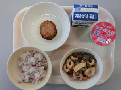 ごはん 梅ちりごはんの具 筑前煮 キャベツ入りつくね ヨーグルト 牛乳