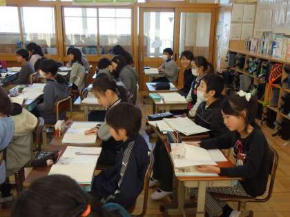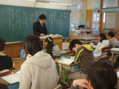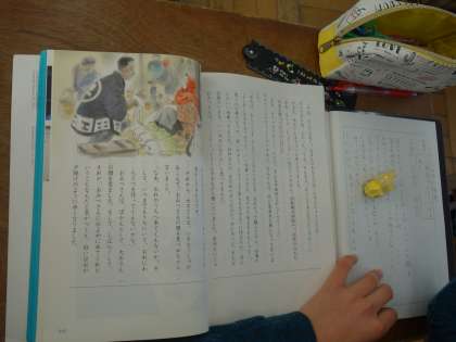 5年生の国語で、「わらぐつの中の神様」の学習をしてきました。今日は、この物語のおもしろさをノートにまとめ、それを語り合うという活動でした。そして、教科書のまとめを参考にして、「構成」、「人物像」、「表現」などといった、物語の読み方のポイントとなる観点について確認していました。