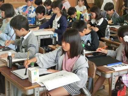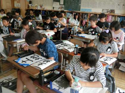 5年生の書写です。「へん」と「つくり」の組み立て方に気をつけて、「土地」という文字を毛筆で表現します。「地」という文字をじっくり見ていると、「つくり」に比べて「へん」の幅が狭いことがわかりますね。