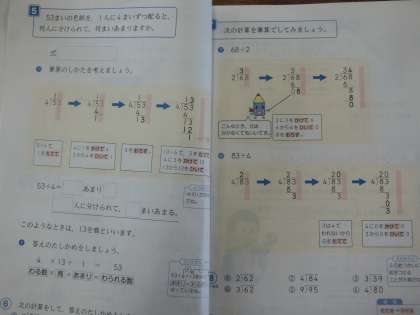 4年の算数です。「角とその大きさ」からわり算の学習に移りました。ここでは、(2,3桁)÷(1桁)の筆算について学びます。今日は、68÷2や83÷4などの問題に挑戦していました。もう一度九九について確認しておきましょう。