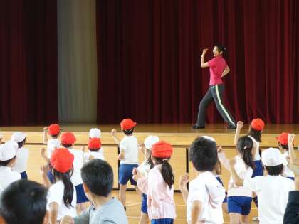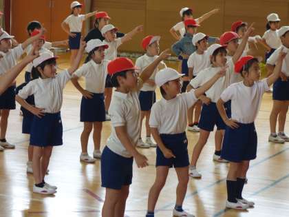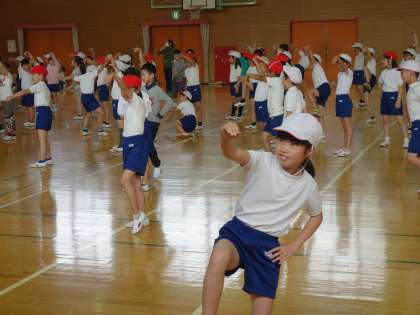 3年生の体育です。学年での運動会の練習が始まっています。詳しく紹介すると「ネタバレ」になってしまいますが、どうやらダンス的な要素と競技を組み合わせた種目になるようですよ。練習はまだ始まったばかりですが、子どもたちも先生もすごく楽しそうです。